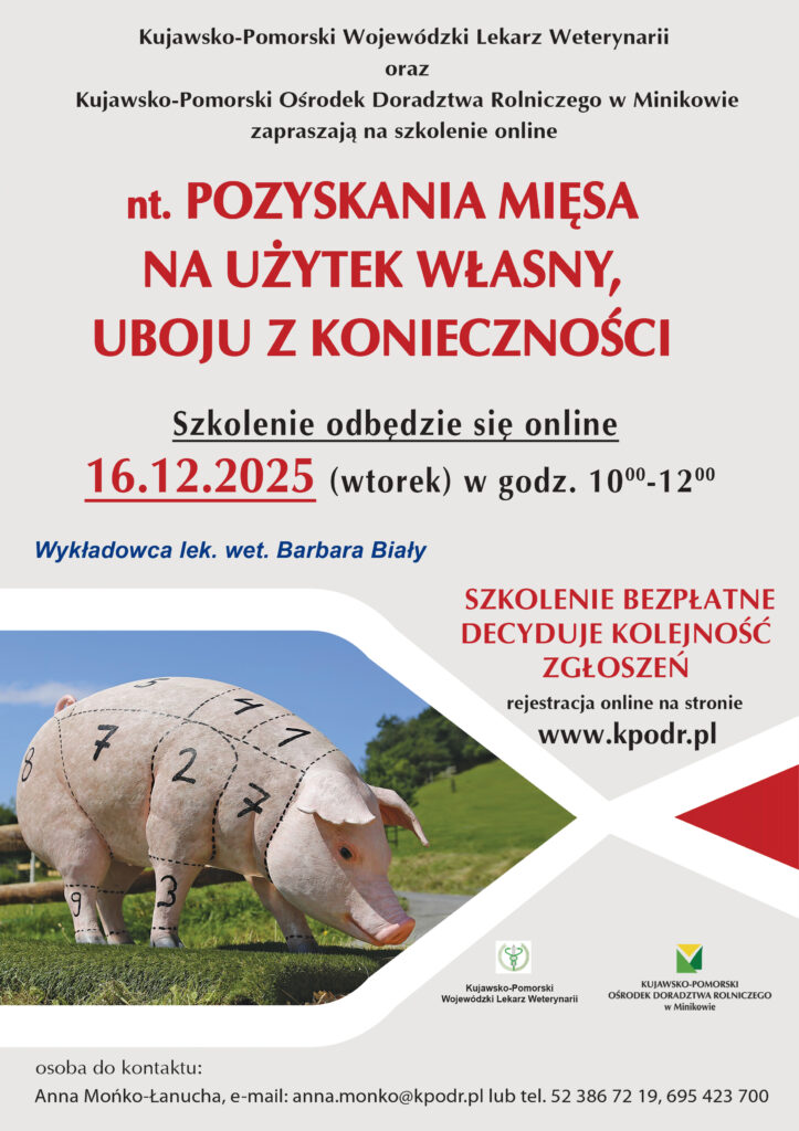 oraz Kujawsko-Pomorski Ośrodek Doradztwa Rolniczego w Minikowie zapraszają na szkolenie online nt. Pozyskania mięsa na użytek własny, ubój z konieczności.